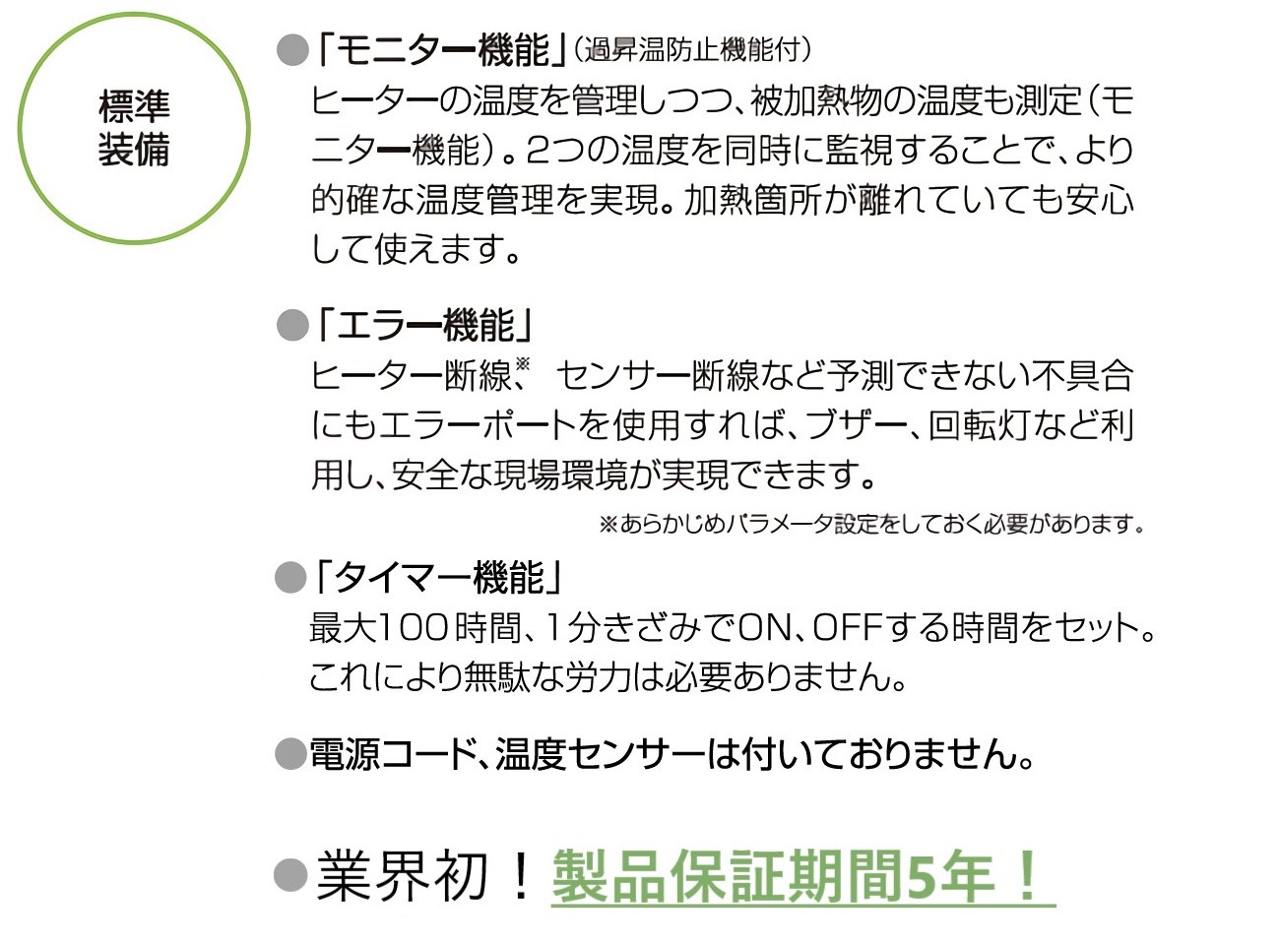 コンパクトでタフなボディ。ヒーターと被加熱物の温度を同時監視し、過昇温防止機能搭載を搭載。