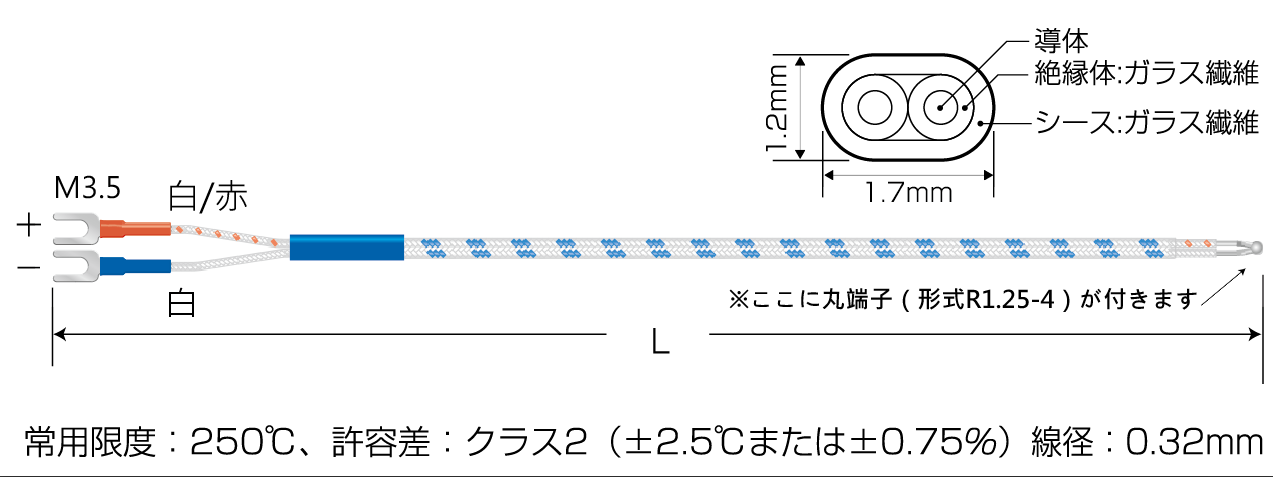 熱電対K先端溶接(デュープレックス)ガラス被覆タイプ 丸端子加工品 TH-8162-3-M