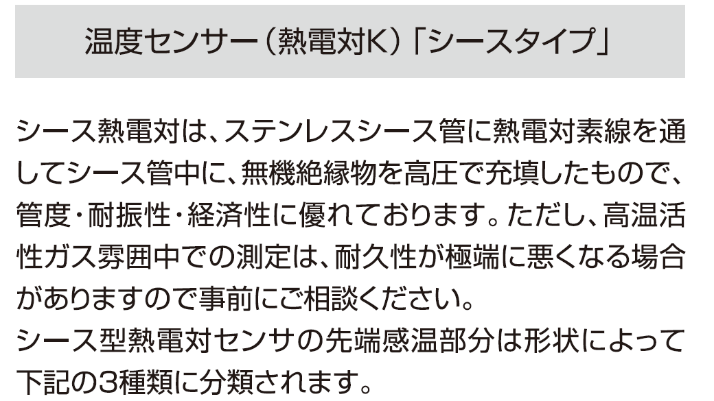 熱電対Kシースタイプは、ステンレスシース管に熱電対素線を通してシース管中に、無機絶縁物を高圧で充填したもので、感度・耐振性・経済性に優れております。