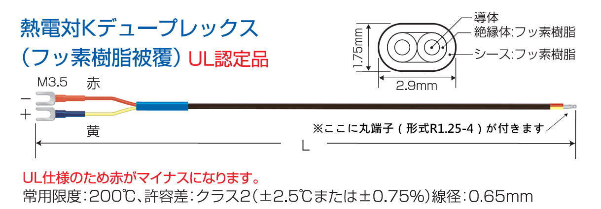 熱電対K先端溶接(デュープレックス)フッ素樹脂被覆タイプ UL認定品 TH-8290-3