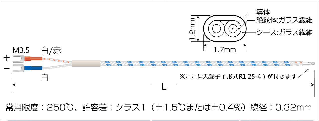 熱電対K先端溶接(デュープレックス)ガラス被覆タイプ 丸端子加工品 TH-8296-1-M