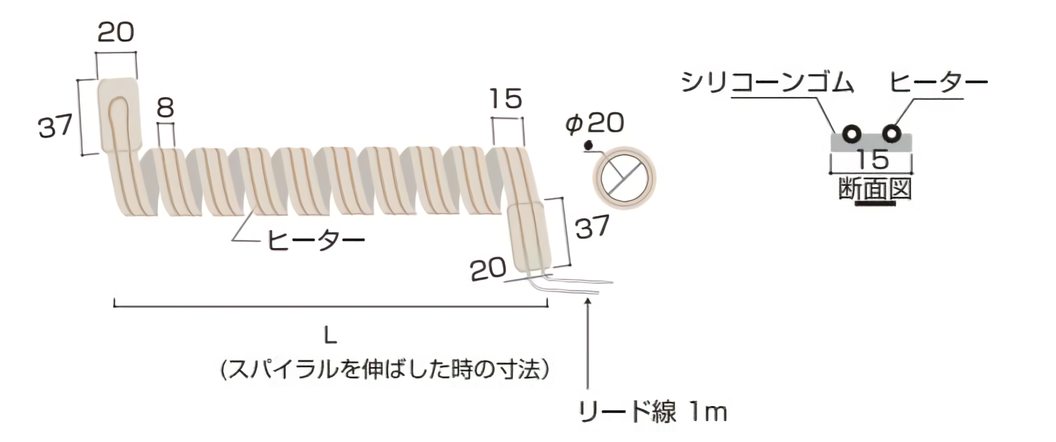 スパイラル状(φ20)にクセ付けされたヒーターです。簡単に巻き付けられ、作業性抜群です。